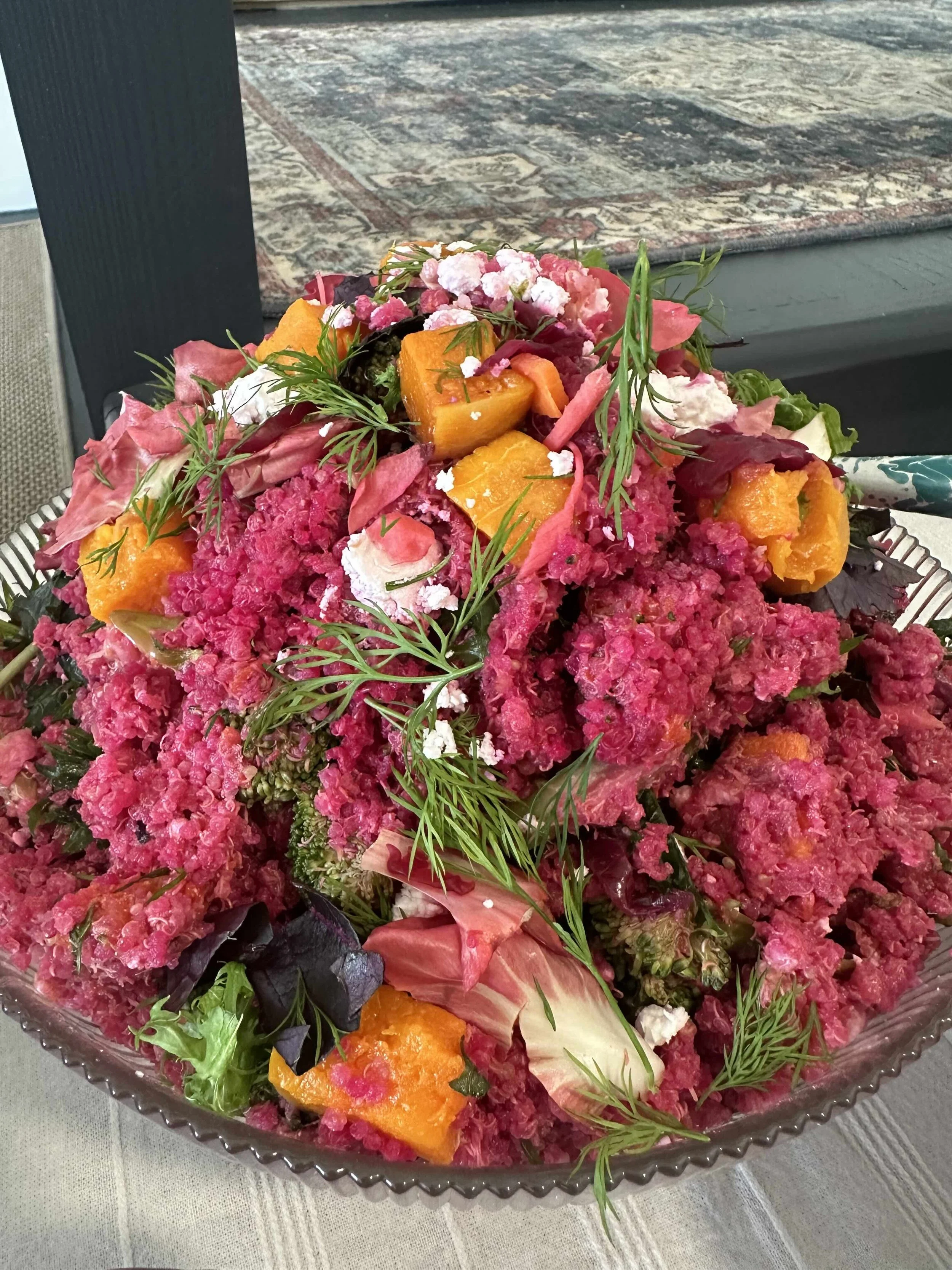 In a big bowl, toss the quinoa with pink beet vinegar — just enough to coat and tint it.